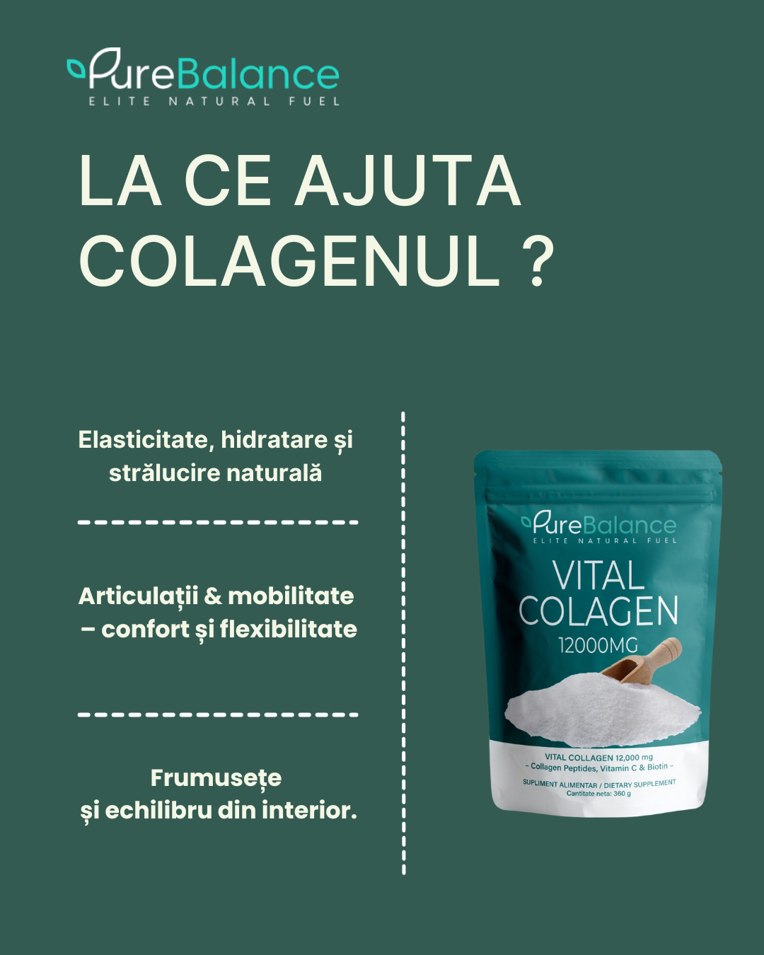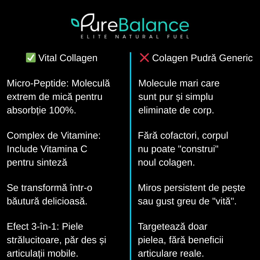 Vital Collagen Pure Balance schimbă complet regulile. Am creat o matrice avansată care combină 4 surse premium de colagen într-o doză masivă de 12.000 mg, transformând acest produs în structura ta supremă de rezistență pentru frumusețe, elasticitate și vitalitate.