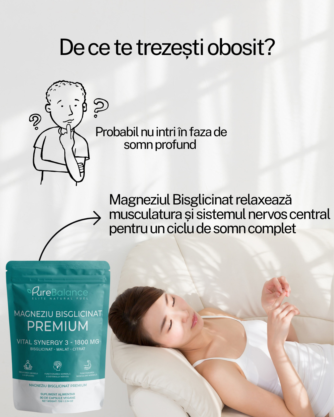Bisglicinatul deblochează tensiunea musculară și forțează corpul să intre în starea de somn profund (Deep Sleep) pentru reparare.
