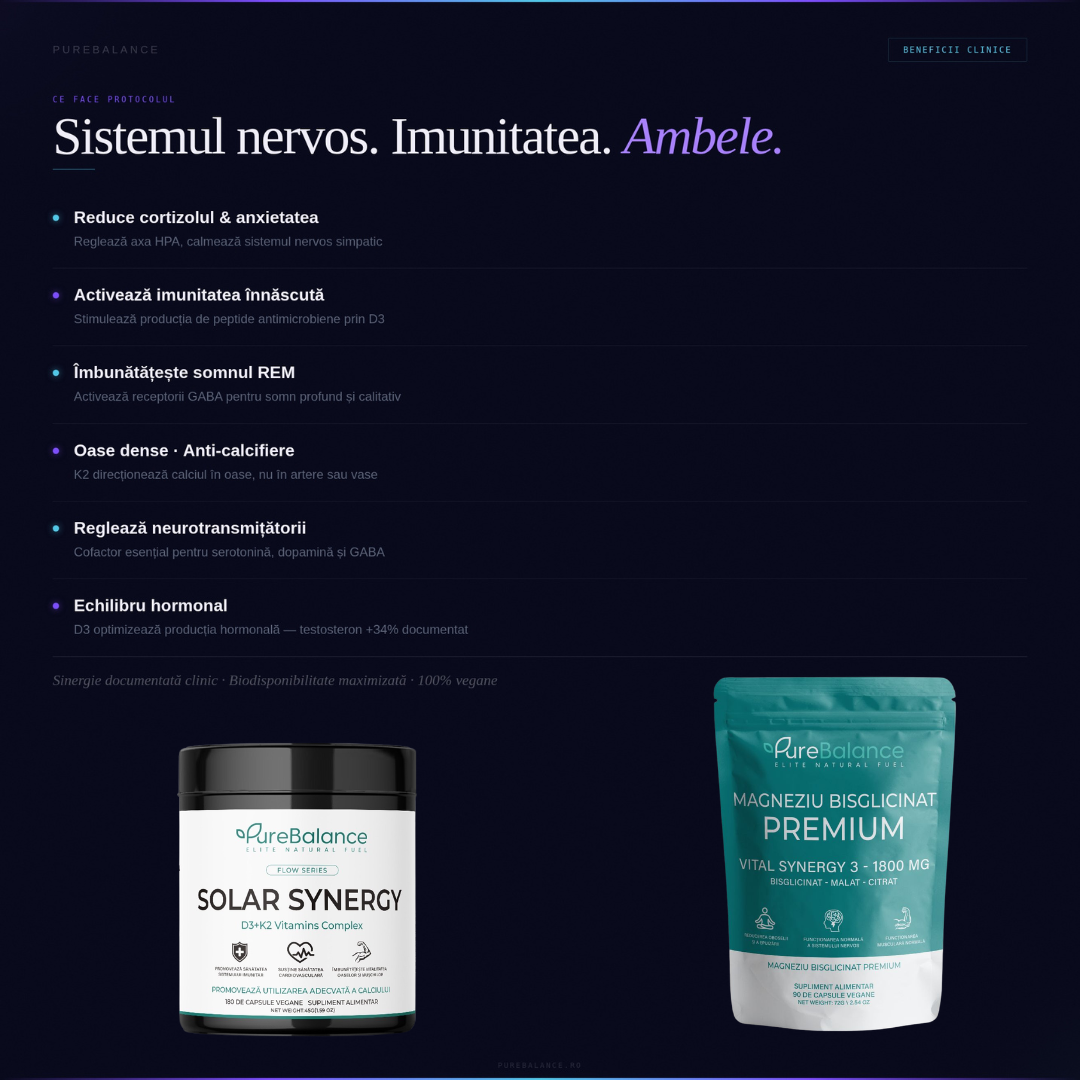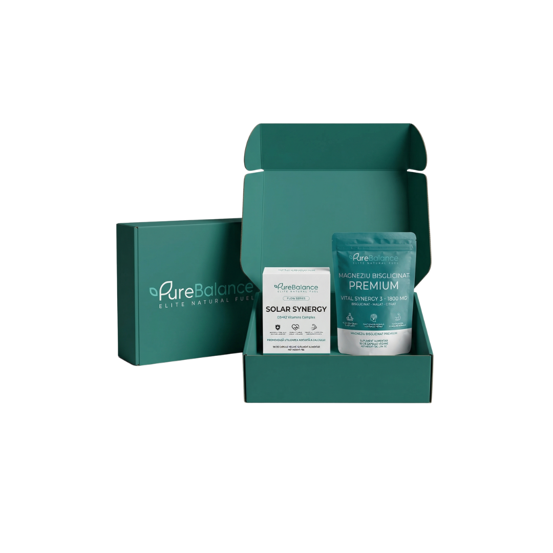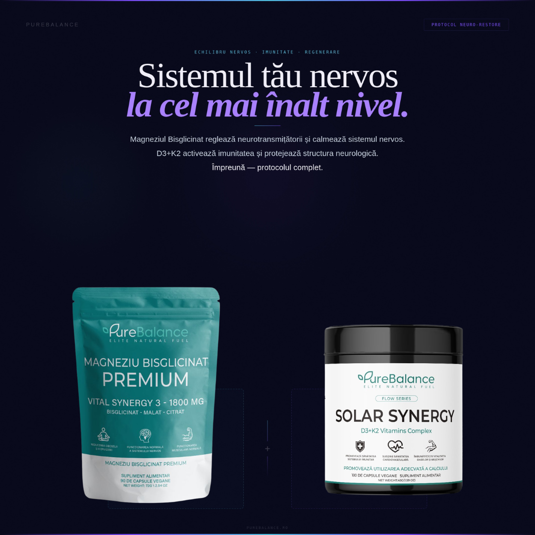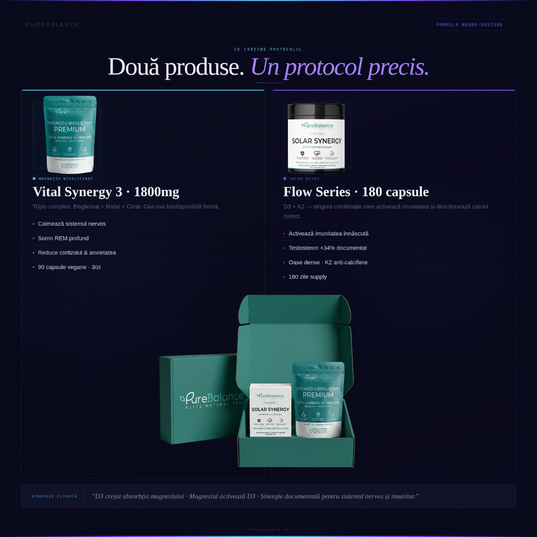 Protocolul NEURO-RESTORE de la Pure Balance corectează acest scurtcircuit biologic. Am unit cel mai curat complex de Magneziu (Synergy 3) cu doza clinică de Solar Synergy D3+K2. Este sistemul suprem anti-burnout, creat pentru a opri „zgomotul mental”, a forța recuperarea nocturnă și a clădi o imunitate de fier.